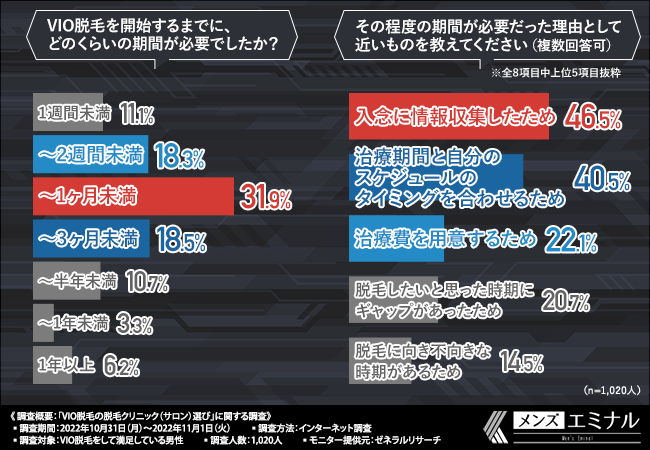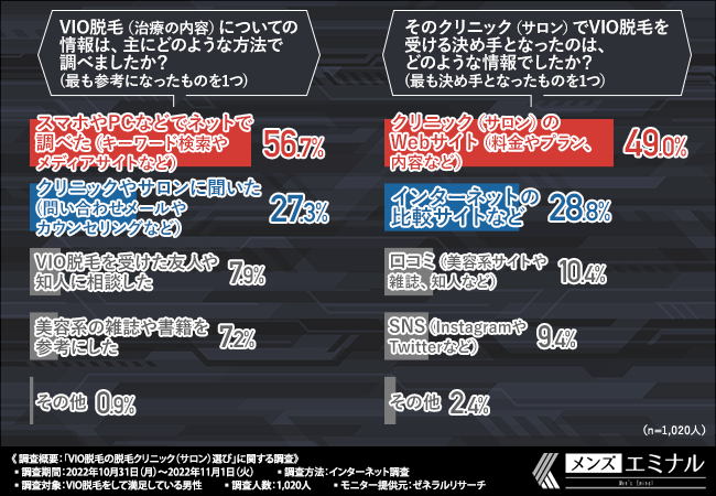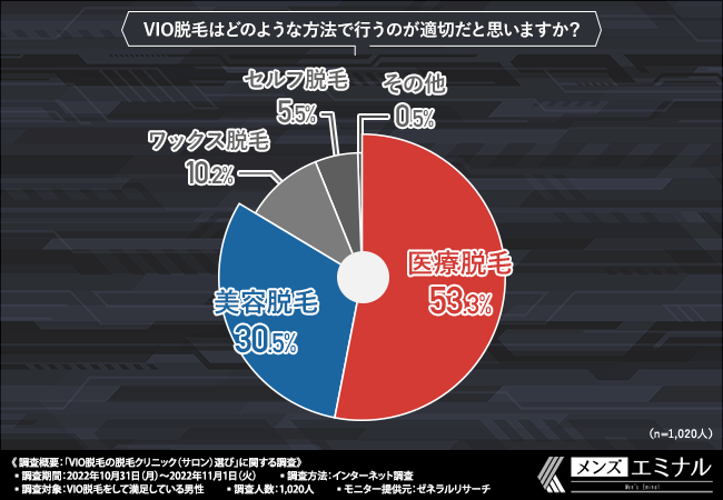 そこで今回、メンズ医療脱毛クリニック『メンズエミナル』(https://mens-eminal.jp/lp/?refmedia=31073)は、VIO脱毛をして満足している男性を対象に、「VIO脱毛の脱毛クリニック(サロン)選び」に関する調査を実施しました。