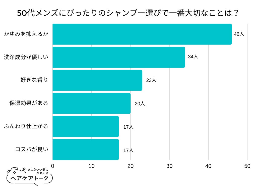 「50代メンズにぴったりのシャンプー選びで一番大切なことは?」とアンケート調査した結果、1位は『かゆみを抑えるか』でした。