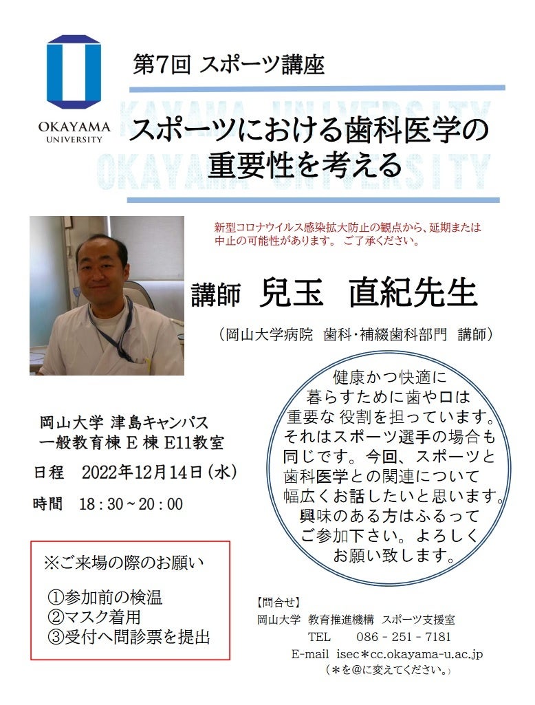今回、第7回となるスポーツ講座「スポーツにおける歯科医学の重要性を考える」を2022年12月14日(水)に岡山大学津島キャンパス(岡山市北区)にて開催します。