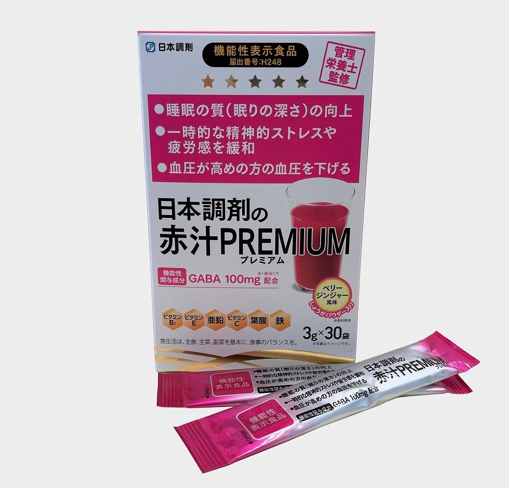 薬剤師・管理栄養士監修のもと2020年に発売された「日本調剤の赤汁」。今回のリニューアルではGABAの配合量※1を見直し(前:33mg、後:100mg)、より皆さまにご活用いただくため、「睡眠の質(眠りの深さ)の向上」「一時的な精神的ストレスや疲労感の緩和」「血圧が高めの方※3の血圧を下げる」のトリプルヘルスクレームを掲げる機能性表示食品にパワーアップしました。