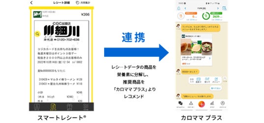 「スマートレシート®」から得られるレシートデータと、「カロママ プラス」に記録された実際の食事データや体重・歩数などのバイタルデータを連携し、食事内容を栄養素分解した結果に基づいて最適な情報をAIがご提案します。栄養バランスを考えたレシピや健康増進に役立つ食品や商品のレコメンド、運動メニューなど健康コンテンツや地域イベントへの参加案内など役立つ情報をお客様にお届けすることで、スーパー細川が掲げる理念「毎日の健康をお届けし、長く暮らしやすいまちづくりへ」の実現を目指します。