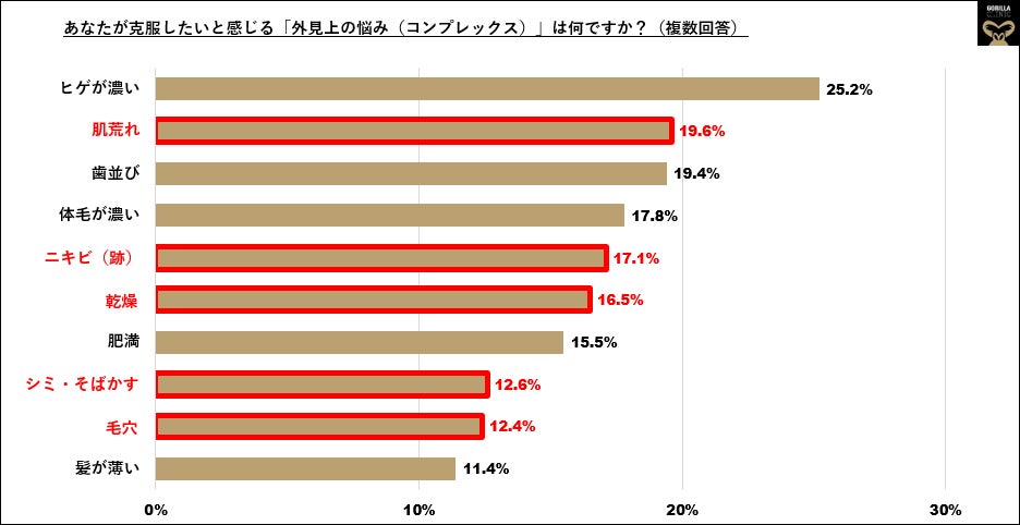 しかしながら当院が10~50代の男性2026名を対象に行なった『世代別/男性の美容意識調査』(※2)では、「克服したい外見上の悩み(コンプレックス)は?」の問いに、右記グラフの通りトップ10のうちランクインした5項目が「肌悩み」に関することでした。