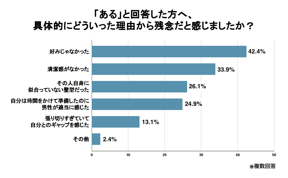 また、デートの時に相手の髪型が残念だと感じた理由を尋ねたところ「好みじゃなかった」と答える女性が最も多く、次に多かったのが「清潔感がなかった」という回答でした。