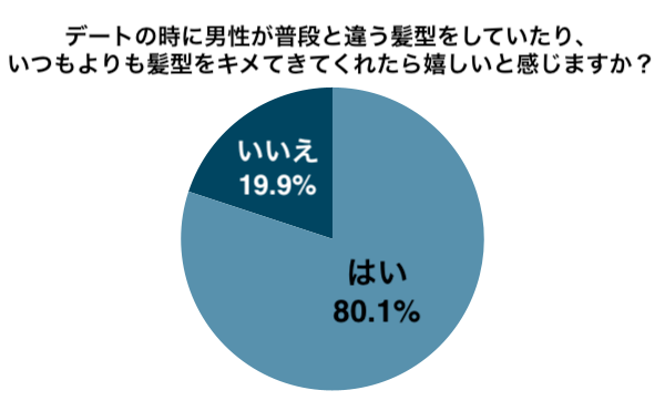 「デートの時に男性が普段と違う髪型をしていたり、いつもより髪型をキメてきてくれたら嬉しいと感じますか?」と質問したところ、80.1%の女性が「はい」と回答しました。