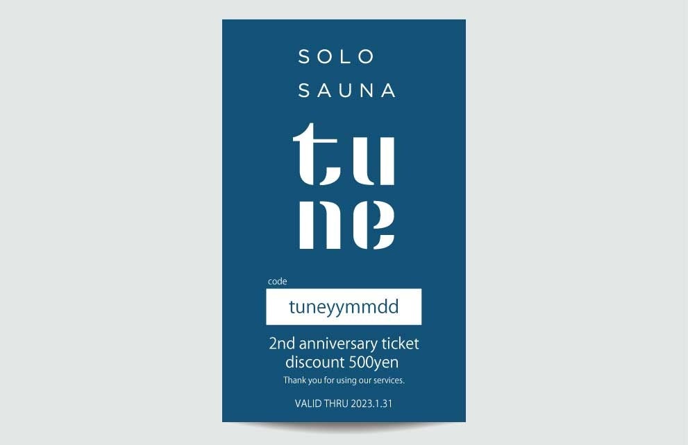 ソロサウナtune2周年を記念して、いつもご利用いただいているお客様への感謝として、来店者に次回割引クーポンチケットを配布いたします。また、ご来店後に優先的に予約いただける次回来店予約の期限を1日(24時間)から7日間に延長いたします。