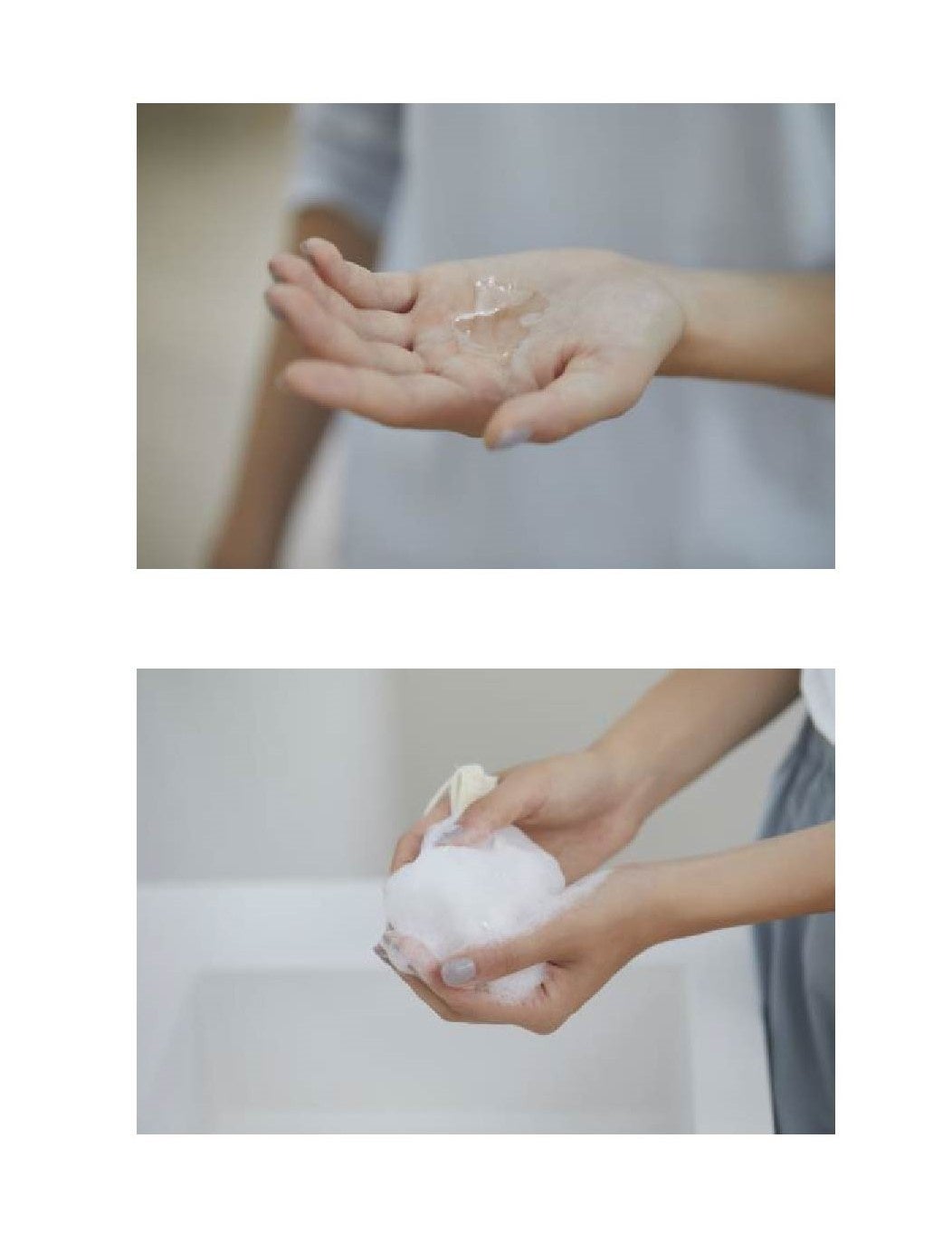 泡立てネットに水かぬるま湯を含ませ、水気を切ったら、500円玉程度の量を目安にネットの上にのせ、空気を取り込むようにもみ込んで泡立てる。または、手のひらで泡立ててもOK。