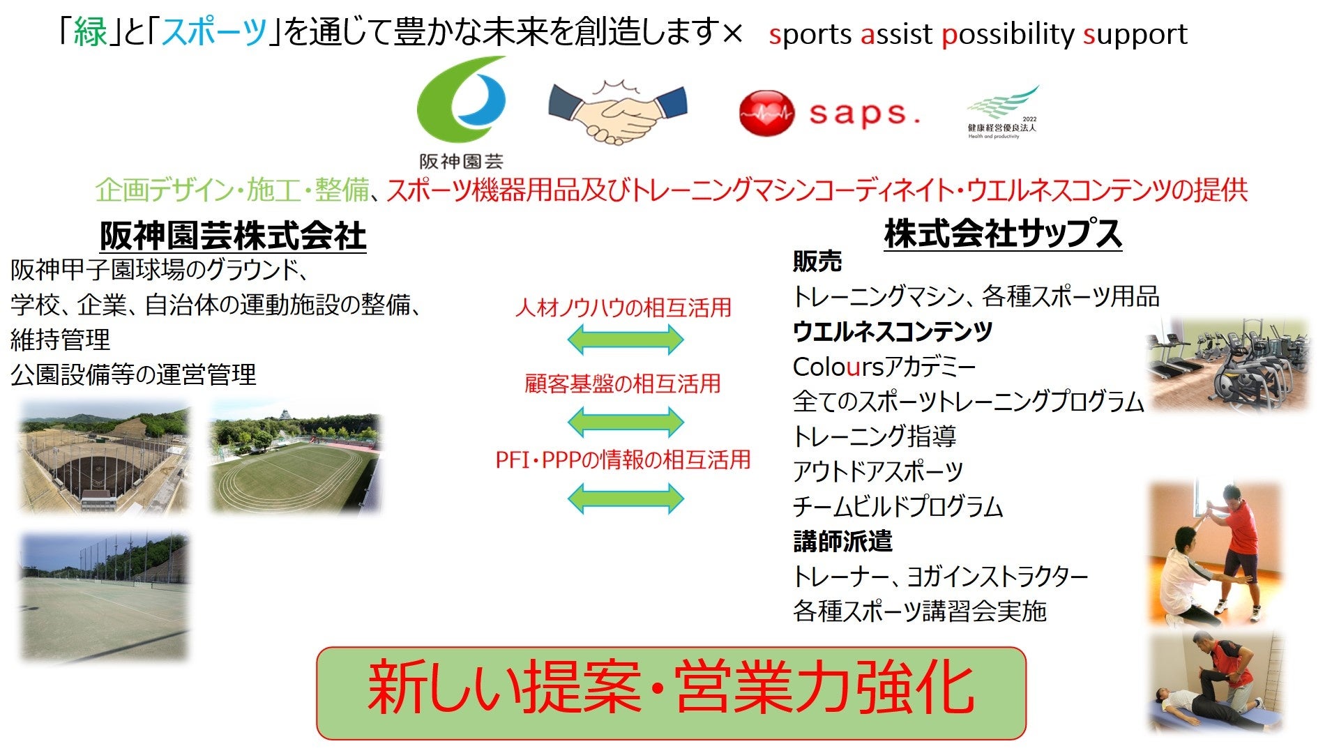 オリジナルマシンや中古・新品マシンの組み合わせにより、コンセプトに応じた最適な投資コストでジム開業をサポートする株式会社サップス(所在地:兵庫県西宮市、代表取締役社長:中瀨敏和)のウエルネスプロダクト事業部は、12月1日から阪神園芸株式会社(所在地:兵庫県西宮市、代表取締役社長:久保田晃司)と、学校向けスポーツ環境整備・運営分野で協業を開始します。阪神園芸は、降雨でぬかるむ阪神甲子園球場のグラウンドを短時間で復旧する“神整備”で知られる企業。阪急阪神ホールディングス株式会社グループの総合緑化事業会社として、球場だけでなく公園や学校、自治体のスポーツ施設などの整備・維持管理で豊富な実績を持っています。一方、サップスには、フィットネスクラブや企業、学校法人向けでの100件以上のトレーニングマシン納入実績があり、指導者や講師の派遣なども展開しています。両社がそれぞれの強みを持ち寄ることで、スポーツ環境づくりの包括的な支援が可能になります。