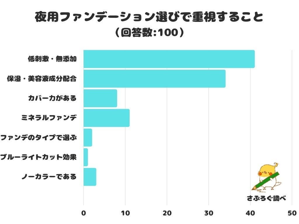 夜用ファンデーション選びで重視することをアンケートにて調査したところ、1位は「低刺激・無添加」でした。
