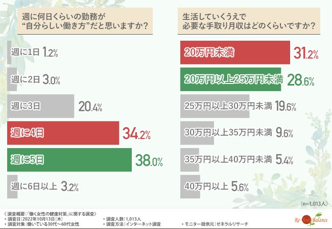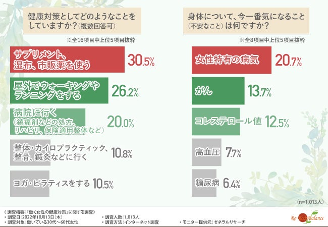 大人のデトックス&スタジオ『Re・Bodybalance』(https://rebody-b.com/)を運営する株式会社シーシーティー協会(本社所在地:東京都新宿区、代表取締役:飯間 百子)は、働いている30代~60代女性に「働く女性の健康対策」に関する調査を実施しました。