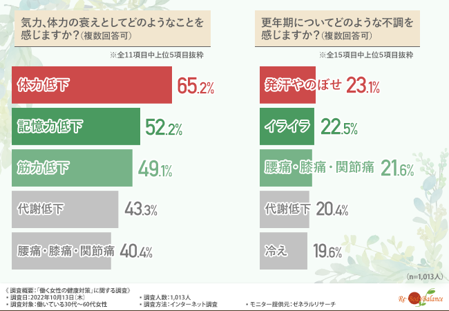 今回の調査で、働いている女性の多くが体力の低下を感じており、また、更年期について発汗やのぼせを感じていることが明らかになりました。