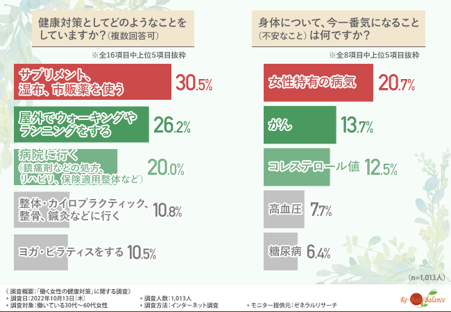 そこで今回、大人のデトックス&スタジオ『Re・Bodybalance』(https://rebody-b.com/)を運営する株式会社シーシーティー協会は、働いている30代~60代女性にを対象に、「働く女性の健康対策」に関する調査を実施しました。