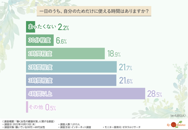 そこで、「一日のうち、自分のためだけに使える時間はありますか?」と質問したところ、『4時間以上(28.5%)』と回答した方が最も多く、次いで『2時間程度(21.7%)』『3時間程度(21.6%)』と続きました。