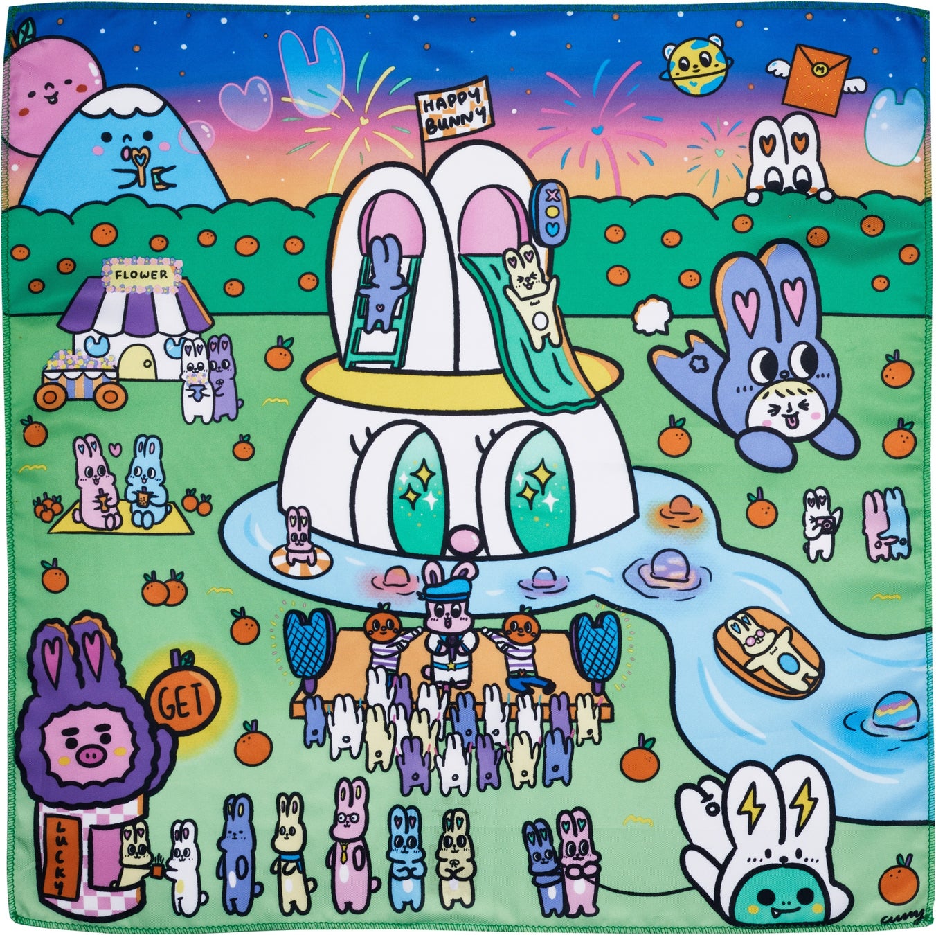 数量限定のKnot Wrap(ノットラップ)は、500mlの再生ペットボトル1本からリサイクルされたポリエステル100%の素材でできています。新年を祝うために集まった可愛いウサギ達は、香港在住のイラストレーターCurry Cheungとアジア圏のLUSHスタッフとの共同デザインです。