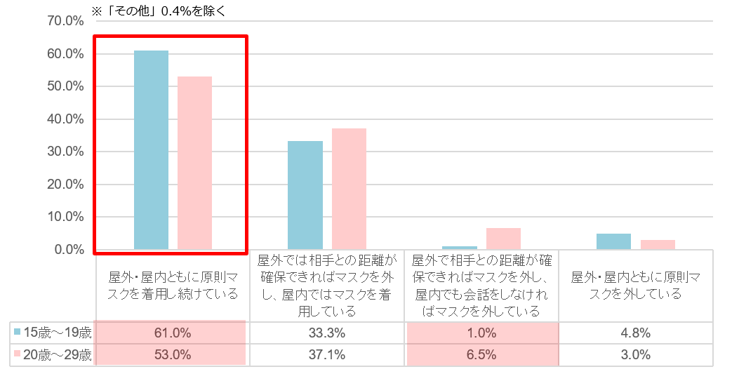 外出時におけるマスク着用に関して、全体の5割以上は屋内・屋外ともに「原則着用」と回答。ただ回答割合においては10代と20代では8%差があり、その他回答結果からも20代女性は、外出時の条件によって「マスクを外す」方が10代に比べ多い傾向がありました。10代と20代での生活環境の違いなどで、マスク着用の意識も変化する傾向が推察されます。