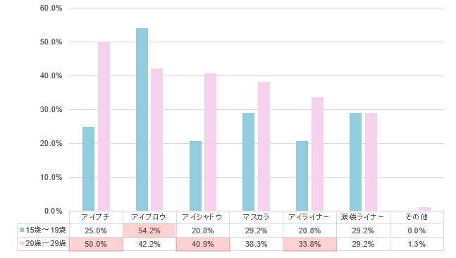 お泊まりメイクをする目元アイテムは、10代と20代による傾向差が出る結果となりました。20代は10代に比べ「アイプチ」「アイシャドウ」の使用率が約2倍多く使用しており、「アイライナー」の使用率に関しては約1.6倍多く使用されてる結果となりました。年齢を重ねるにつれてお泊まりメイクの幅も広がっているのかもしれません。