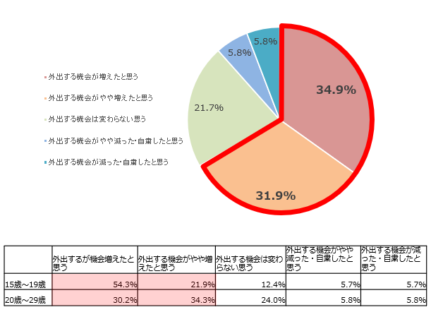 2022年の外出機会の頻度として過去2年間(2020年・2021年)と比較した時、「増えた」「やや増えた」と回答した方が全体の6割以上いる結果となりました。年代別の傾向差としては、10代は20代と比べて「外出が増えた」と感じる方が約14%多くいることが判明しました。一方で、外出する機会は「変わらない」と感じる方は10代に比べ20代に多い傾向から、学生が比較的多い10代はオンラインからオフラインの授業に徐々に切り替わり、社会人が比較的多い20代は在宅勤務を継続している傾向があることが推察されます。
