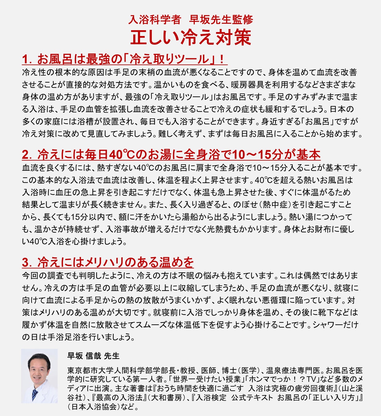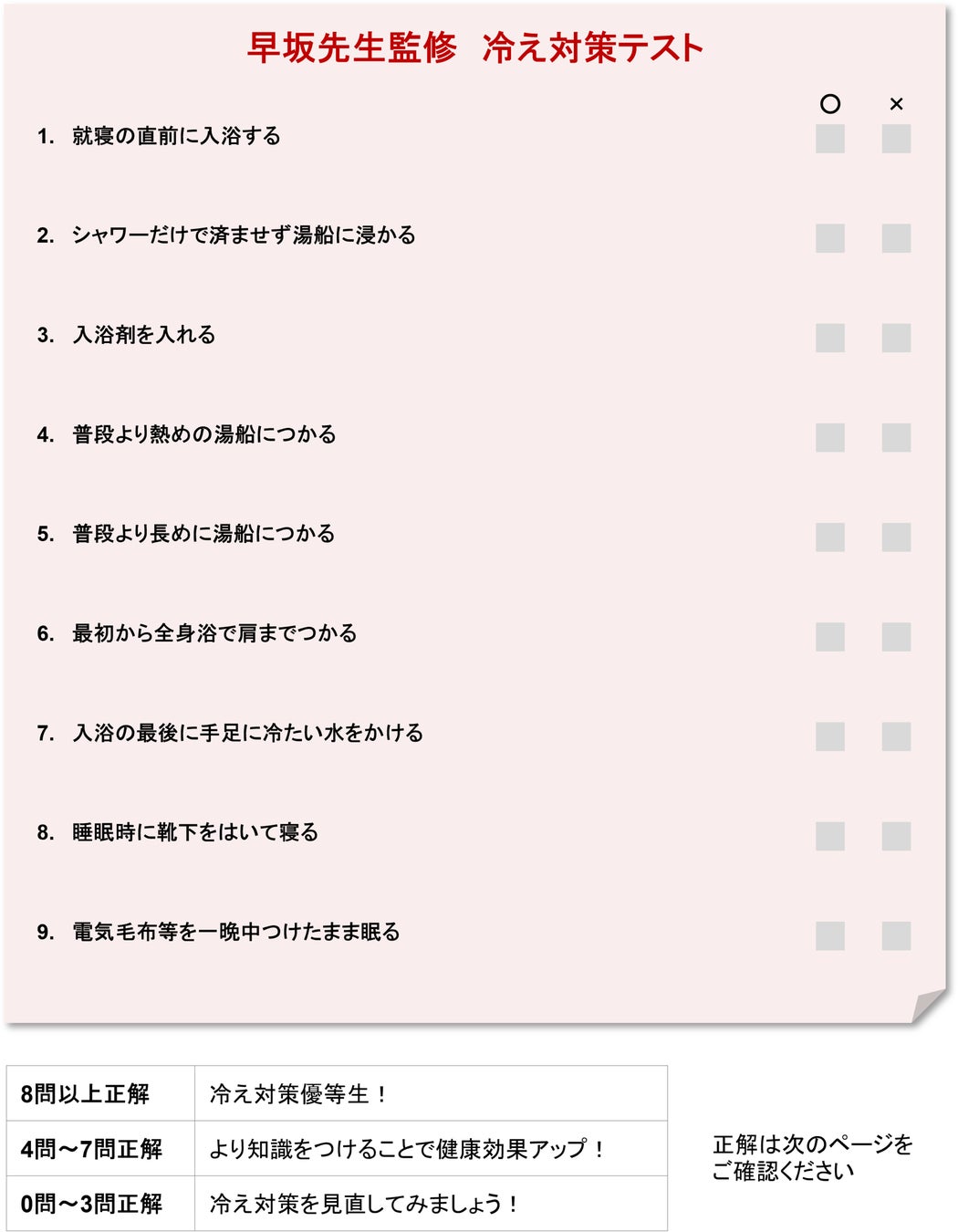 入浴科学者 早坂先生に正しい冷え対策をチェックする簡易テスト「冷え対策テスト」を作成いただきました。