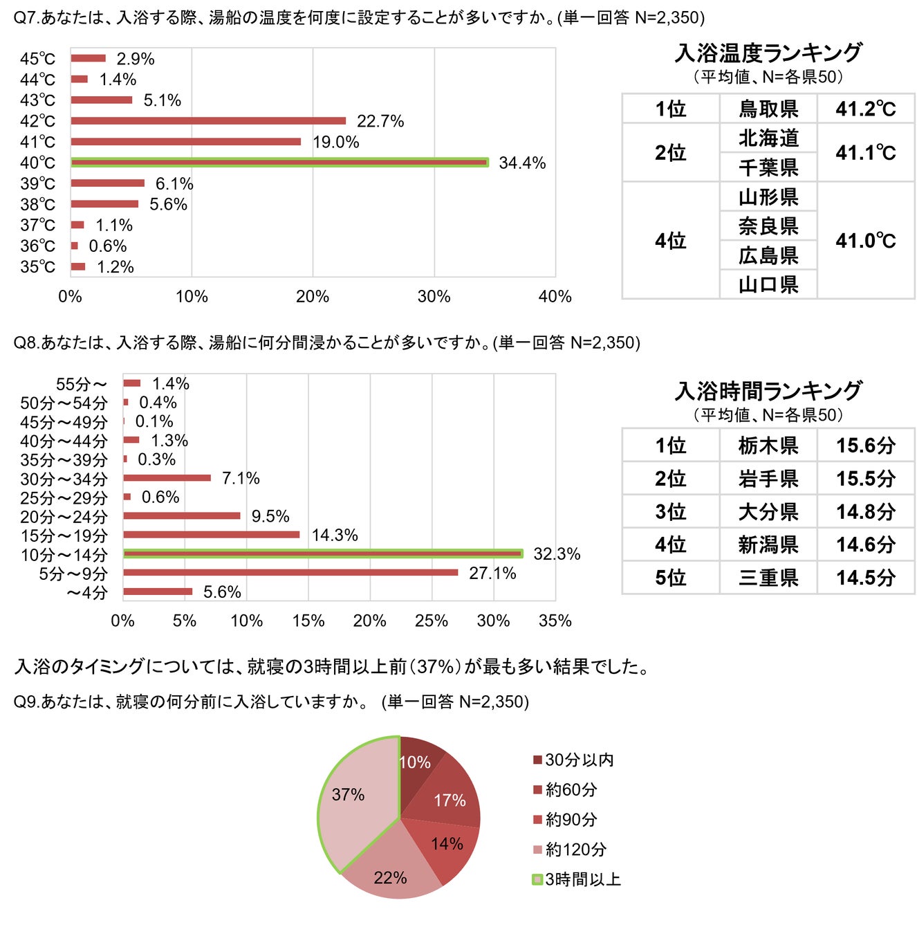 普段の入浴方法について聞きました。その結果、湯船の温度は40℃(34.4%)が最も多く、特に高い地域は鳥取県の41.2℃でした。入浴時間は10分~14分(32.3%)が最も多く、特に長い地域は栃木県の15.6分でした。