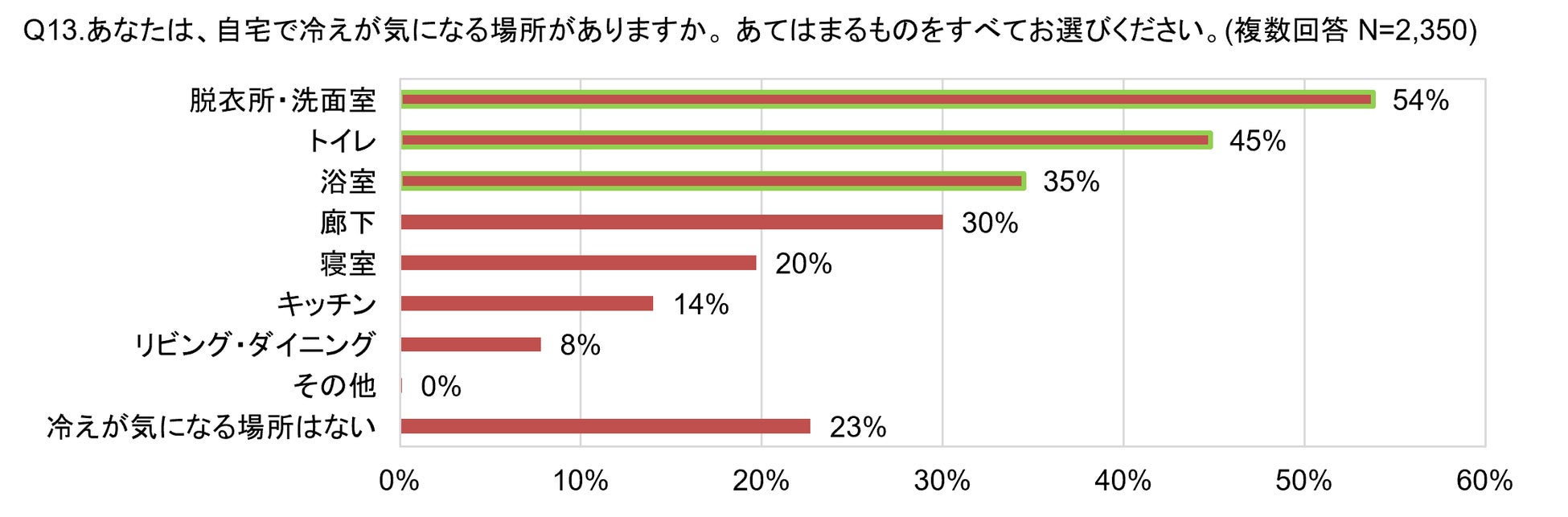 これからの季節、自宅の寒さで辛い思いをする方も多いのではないでしょうか。自宅で冷えが気になる場所を聞いたところ、最も多い回答は「脱衣所・洗面室」 (54%) 、続いて「トイレ」 (45%) 、「浴室」 (35%)でした。
