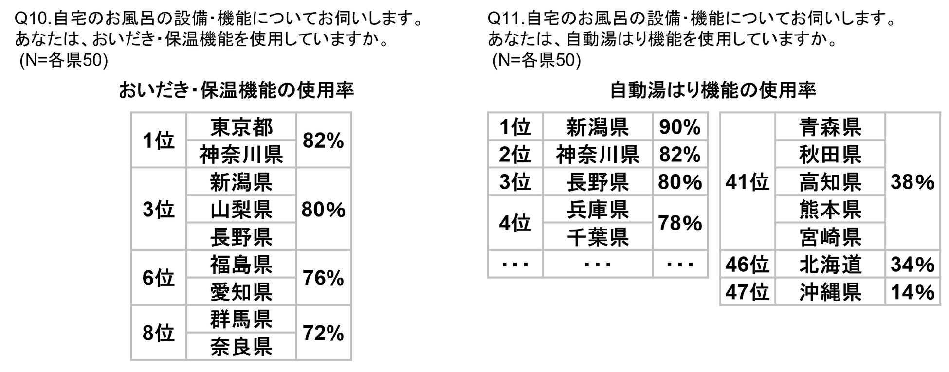おいだき・保温機能 東京都・神奈川県が8割、自動湯はり 新潟県が9割