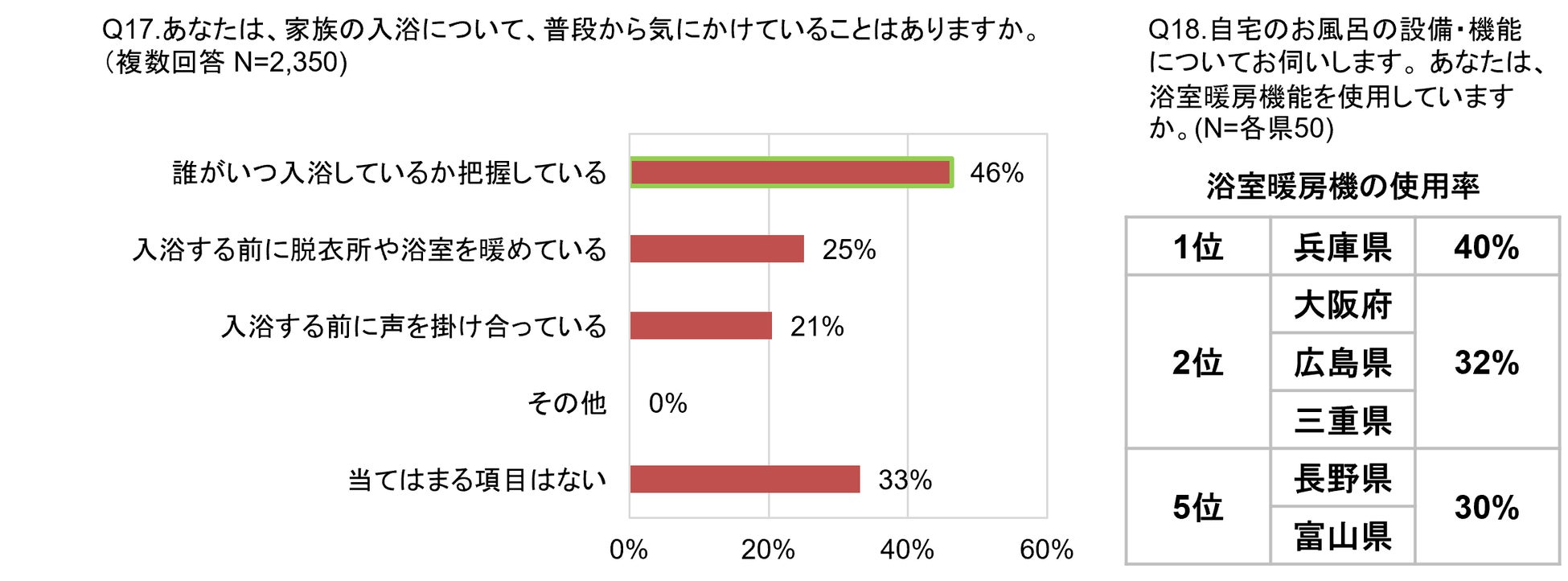 ヒートショックの対策についての設問では、家族の入浴に関して「誰がいつ入浴しているか把握している」(46%)が最も多い回答でした。浴室の暖房に欠かせない「浴室暖房乾燥機」の使用率は21%となり、地域別では兵庫県(40%)が最も高いことが分かりました。
