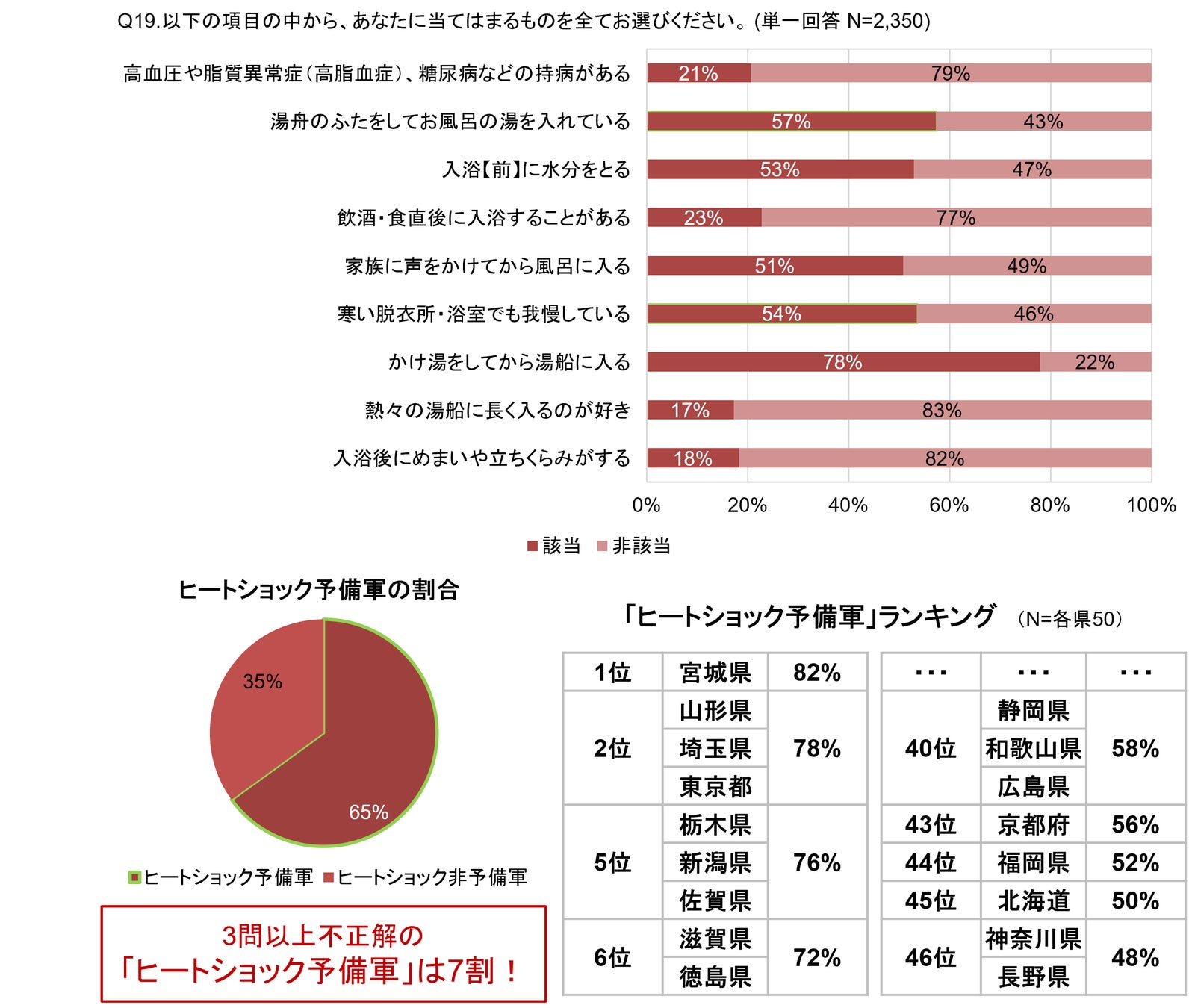 ヒートショックを起こす可能性を確認する「ヒートショック予備軍テスト」を、早坂先生に作成いただきました。今回の調査の結果65%の回答者が、3問以上不正解の「ヒートショック予備軍」と判定されました。最も多い危ない習慣(不正解)は「湯船のふたをしてお風呂の湯を入れている」(57%)、続いて「寒い脱衣所・浴室でも我慢している」(54%)でした。