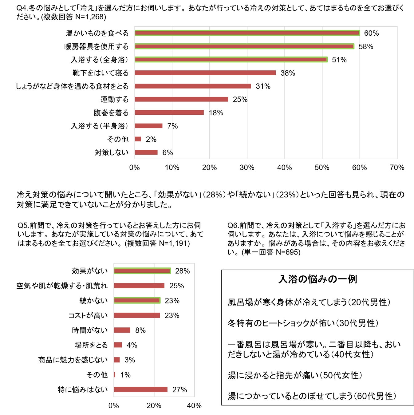 冷えに悩む回答者にどのような対策を行っているか聞きました。最も多い回答は「温かいものを食べる」(60%)、続いて「暖房器具を使用する」(58%)、「入浴する(全身浴)」(51%)でした。