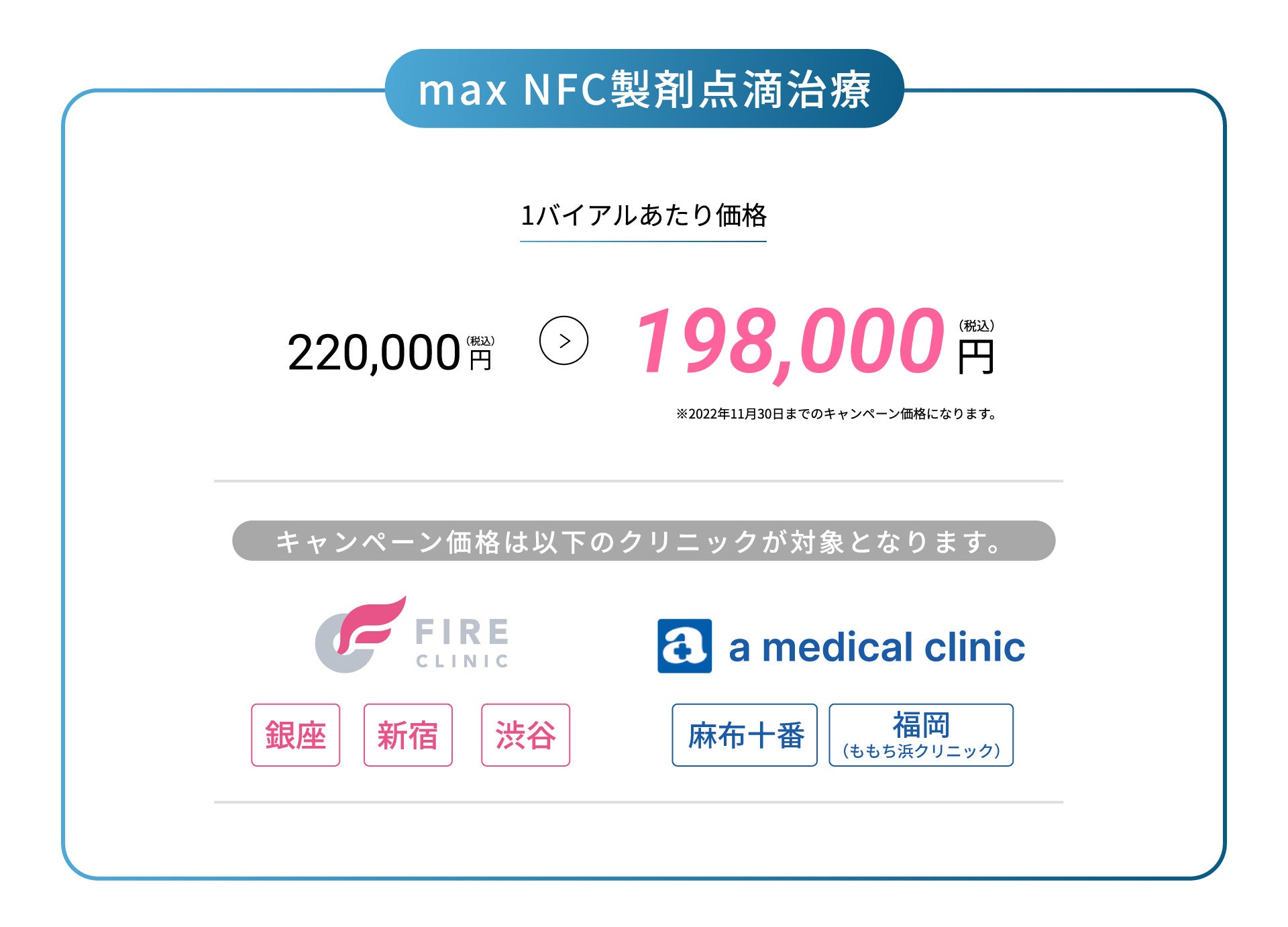 現在、最新製剤開発にあたって「麻布十番aメディカルクリニック」と「FIRE CLINIC」のコラボキャンペーンを実施中。1バイアルあたり通常220.000円のところ、特別価格178.000円で提供します。
