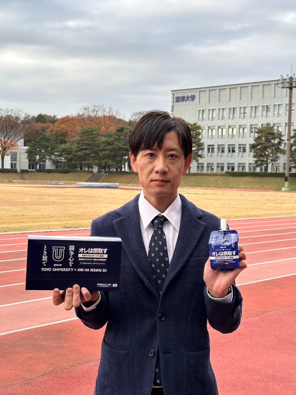 このたびは静岡県東部地域との関わり(地域交流、地域貢献)や、東洋大学陸上部(鉄紺)の魅力を伝える取り組みを実施させていただきましてありがとうございます。ハードな練習直後のリカバリーの向上や普段のコンディショニングにチームとして活用している『オレは摂取す』の『鉄紺バージョン~闘争心をとき放て~』の発売は商品とチームカラーである鉄紺の認知度を高める絶好の機会としてコラボしていただきました。より多くの方々に『オレは摂取す 鉄紺バージョン~闘争心をとき放て~』を手に取っていただけることで、選手強化、チーム強化につながります。またこのたびの取り組みの企画、商品化にいたるまでダイトー水産株式会社、齋藤啓治郎社長はじめ関係部署の方々には深く感謝申し上げます。