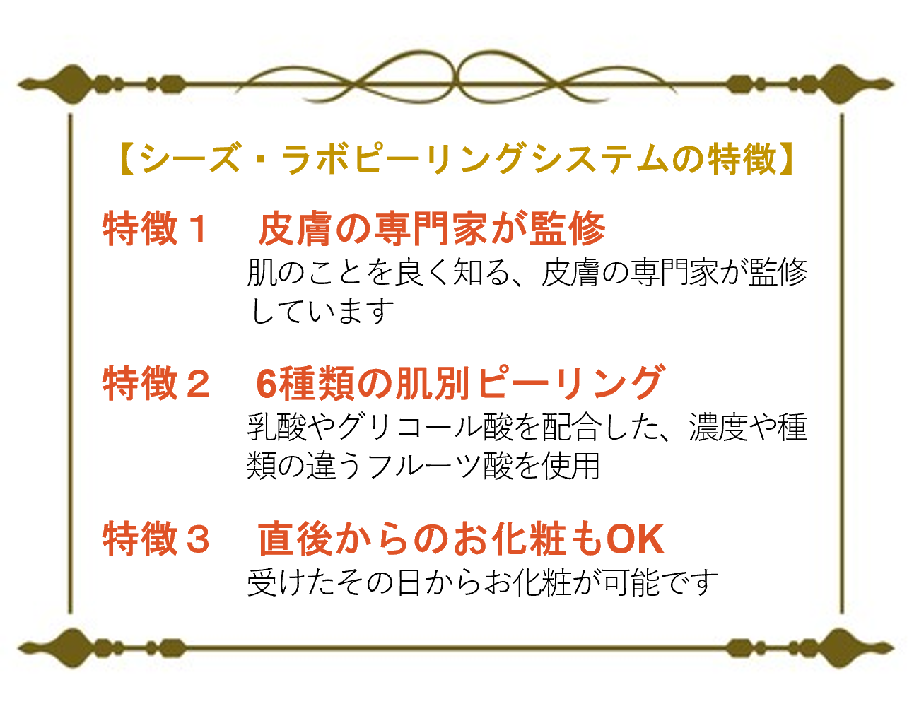 濃度とタイプの違うフルーツ酸の種類を組み合わせてその日の肌状態に応じておこなうピーリングは、シーズ・ラボでニキビケア からエイジングケア まで様々なトリートメントに使用され、角質を取り除き美肌をサポートしてきました。