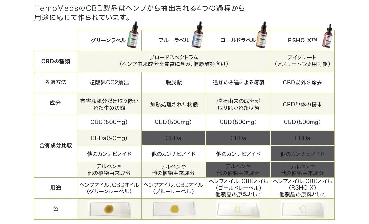 日本では数少ない規格の商品も含め4つのタイプの特徴的なCBDオイルがあります。
