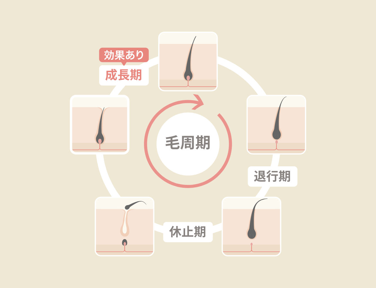 脱毛は、毛が生え揃っている「成長期」の時期に行わないと脱毛効果が得られないため、約2か月に1回の頻度で