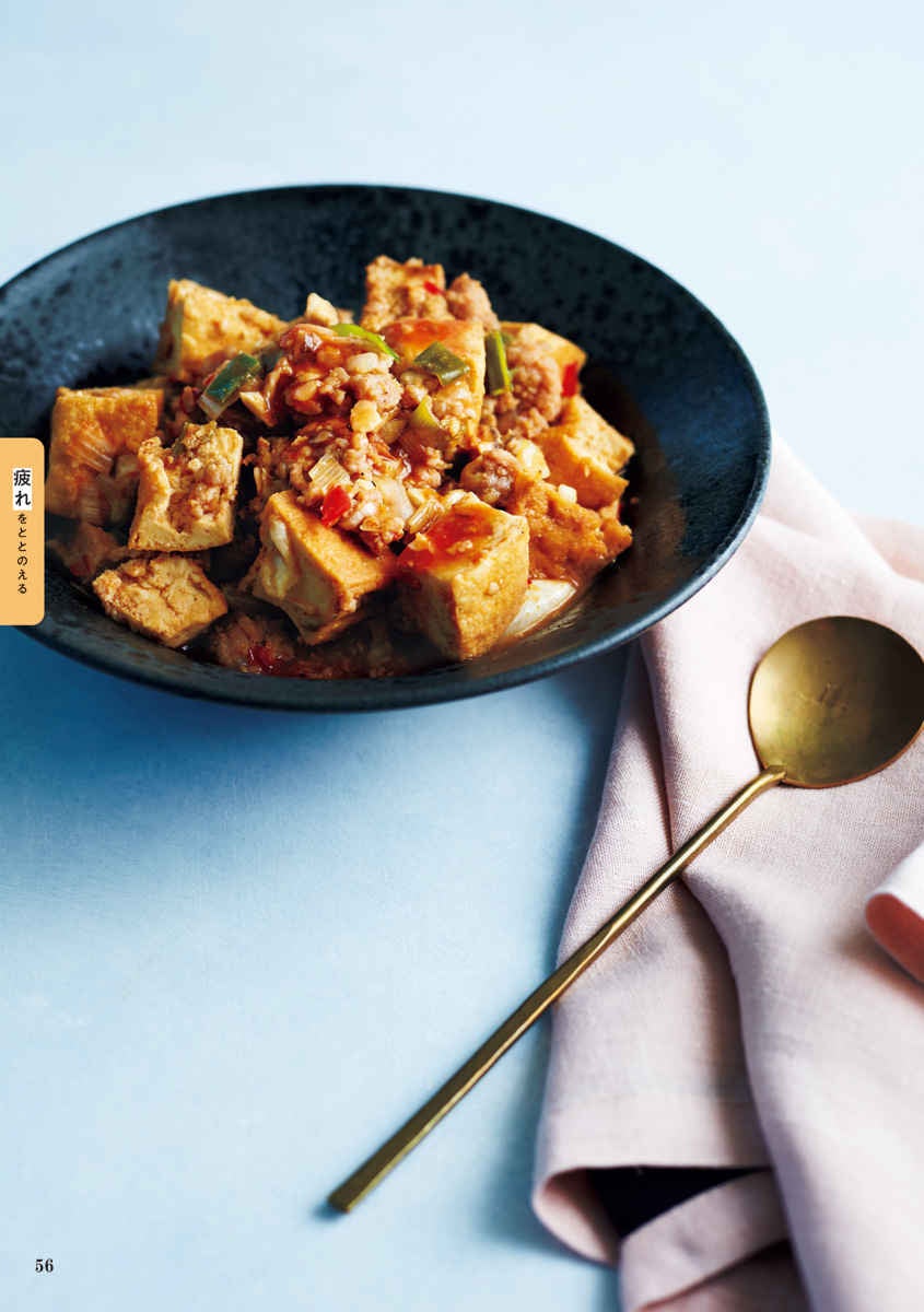 ▲レンチンでつくったとは思えない本格中華。たんぱく質豊富な厚揚げは崩れにくいので、いつもの麻婆豆腐もぐっとボリューミーに。