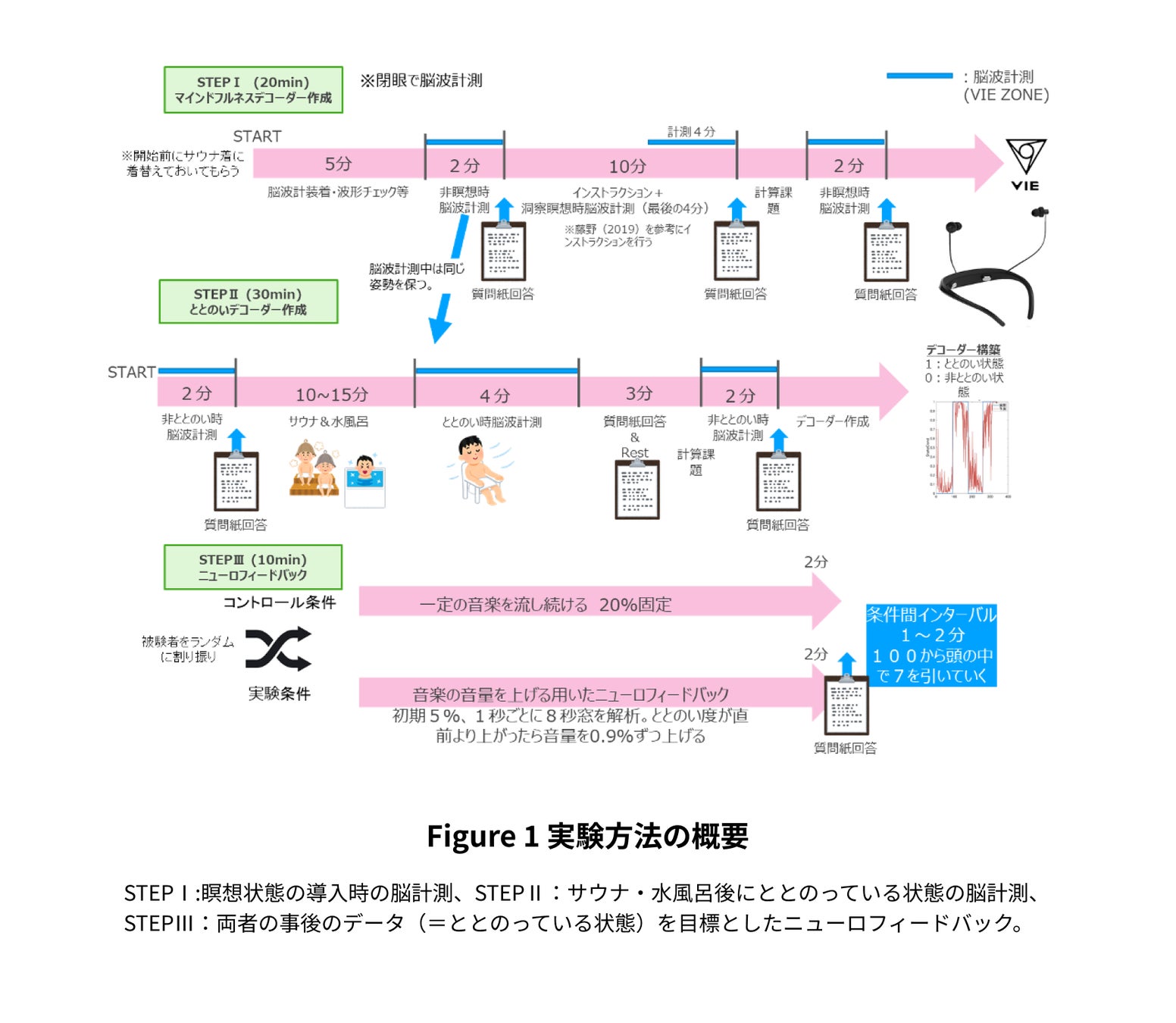 12名の日常的にサウナで“ととのう“経験をしていて、かつ瞑想を行っている(自己報告)方々に協力いただき、以下のような3ステップで実験を行いました(Figure 1)。