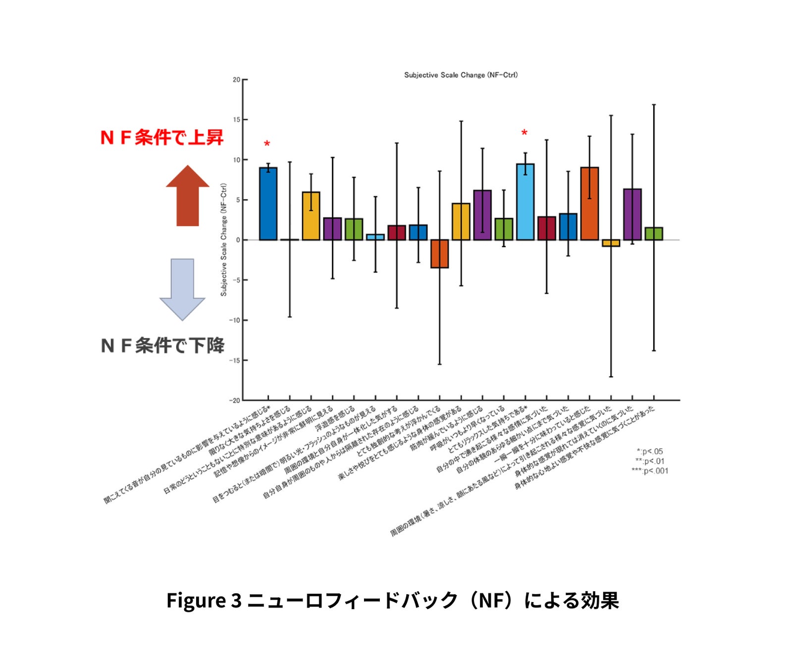 さらに「瞑想時と水風呂後のととのい時の脳活動パターン」を学習させたデコーダーを用いたニューロフィードバックによって「ととのう・瞑想」に近い状態を自ら導入できるかを検証しました。その結果、コントロール条件と比較し、ニューロフィードバック条件では「聞こえてくる音が自分の見ているものに影響を与えているように感じる(visual synesthesia)」と、「とてもリッラクスした気持である」の2項目で有意に上昇していました(Figure 3. ともにp<.05, single tailed, uncorrected)。