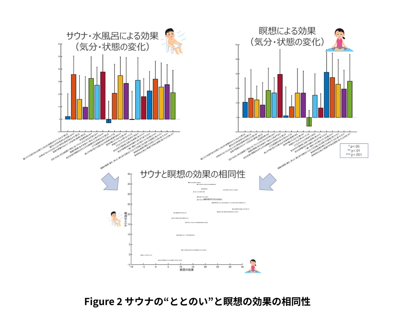 サウナ-瞑想の効果(事後―事前の各尺度得点の変化)の相関は、0.71(p<.001)と高い結果となりました(Figure 2)。特に「周囲の環境と自分自身の一体化体験(変性意識状態における’Experience of unity’)」および,「一瞬一瞬を十分に味わっていると感じた(マインドフルネス指標)」が共通して高いことが背景にあります。
