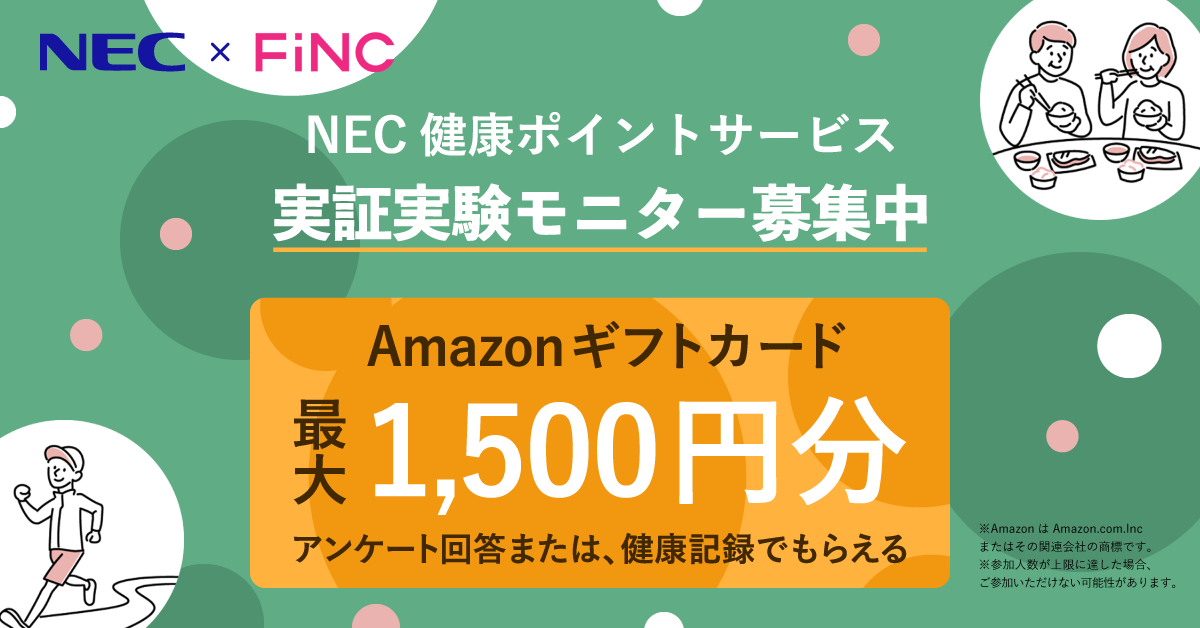 「FiNCアプリ」(※)でライフログを記録することで健康ポイントを貯めることができ、AIによる未来予測などのNECオリジナルコンテンツもご利用頂けます。また、健康ポイントを貯めたり、オリジナルコンテンツを利用してアンケートに回答することで、謝礼としてAmazonギフトカード最大1,500円分に申込できます。