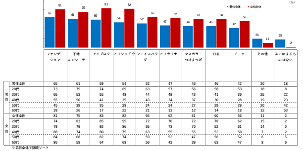 実施しているメイクの上位は、男性がベースメイク、女性がアイメイクと違いがみられる