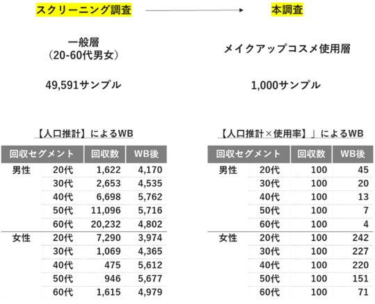 | 有効回答数 | スクリーニング調査 49,591名 本調査(メイクアップ使用者) 1,000名 ※性年代ごとに100サンプル回収 |
