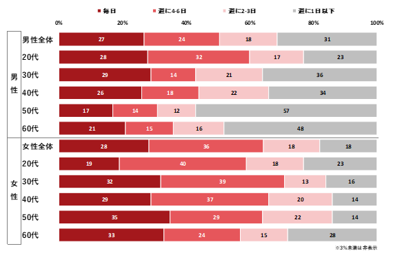 またメイクの頻度について、「毎日」は、男性全体で27%、女性全体で28%と同程度だった。性年代別にみると、男性では40代と50代、女性では20代と30代を境に、毎日メイクするかの差が出ている。