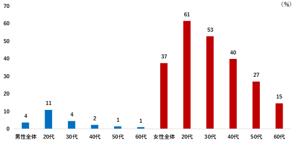 メイクアップコスメの使用率は、男性全体で4%。年代ごとにみると、20代が11%と最も高く、30代以降は4%以下と低い結果となった。女性全体(37%)と比べて、大きな差がみられた。