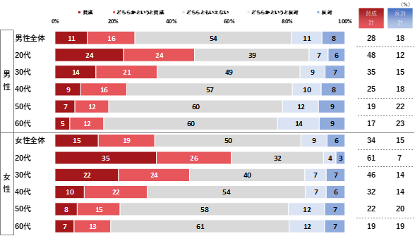 男性がメイクすることへの賛否は、男性全体では賛成が28%、反対が18%、どちらともいえないが54%だった。年代別にみると、男性20代は賛成が48%と半数近くを占める結果となった。女性も20代は賛成が61%と、他の年代と比べて最も高かった。男女ともに年代が低くなるにつれて賛成派が多く、男性のメイクアップは若い年代から浸透していくのではないかとみられる。