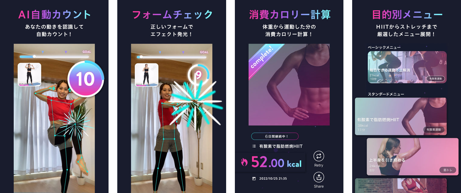 誰しもが健康になるためには、何をすれば良いのか分かるにも関わらず、「一歩踏み出すことができない」「継続ができない」という長年の課題を、当社が考える世界観/思想感×テクノロジーを用いて解決できるのではないか。と考えました。その一つの手法がAIを用いた骨格検出になります。動きを認識し、それに対して反応がある=リアクティブ性を強みにし、スマホ1台あれば自宅を最高のフィットネス空間に変え、ココロカラダオドル毎日をサポートしていきます。