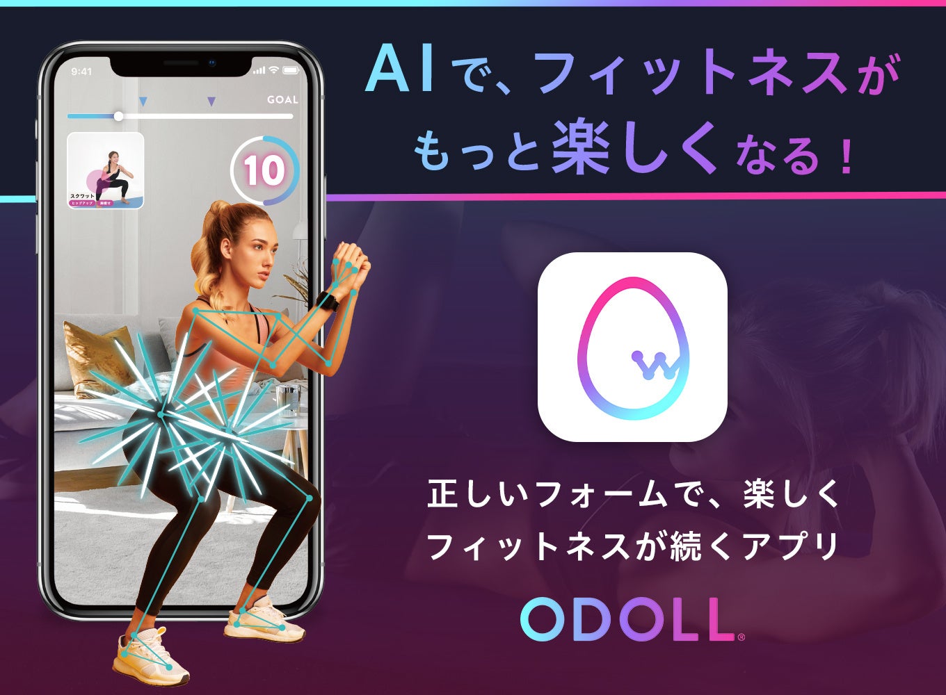 AIフィットネスアプリ「ODOLL」を開発・運営する、ならでわ株式会社(本社:栃木県宇都宮市、代表取締役:大塚拓也、以下当社)は12月1日(木)に正式版をリリースしました。ODOLLアプリはAIがアプリに映った自分の動きを認識して、正しくトレーニングができると弾けるエフェクトと共に自動で回数をカウントします。トレーニングは見本動画と音声ガイドもあるので迷わず行うことができ、無我夢中になれて達成感を味わうことができる唯一のフィットネスアプリです。