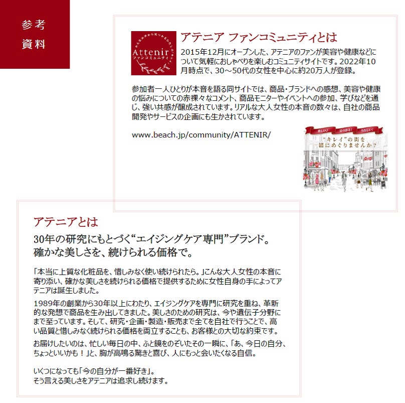 「アテニア ファンコミュニティ」は、多くの大人女性の美容や健康にまつわる悩みや本音、共感があふれる場です。対面では話しにくい本音も語りやすい。だからこそ、相互の共感や共鳴の中から、勇気づけられ、一歩踏み出す力へとつなげられるのではないかとの想いから、コミュニティサイトにおいて今回のテーマを展開しました。