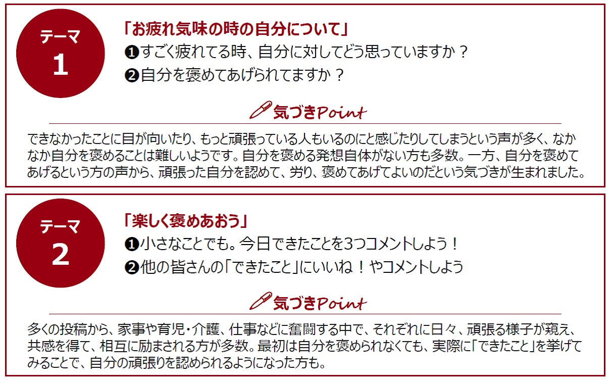 参加者からの投稿や、参加者同士のやりとりを通じて、自分を褒めることが、自身を含めた一人ひとりの存在意義や、その大切さに気づくきっかけを与えてくれています。