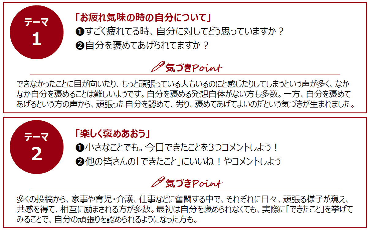 参加者からの投稿や、参加者同士のやりとりを通じて、自分を褒めることが、自身を含めた一人ひとりの存在意義や、その大切さに気づくきっかけを与えてくれています。