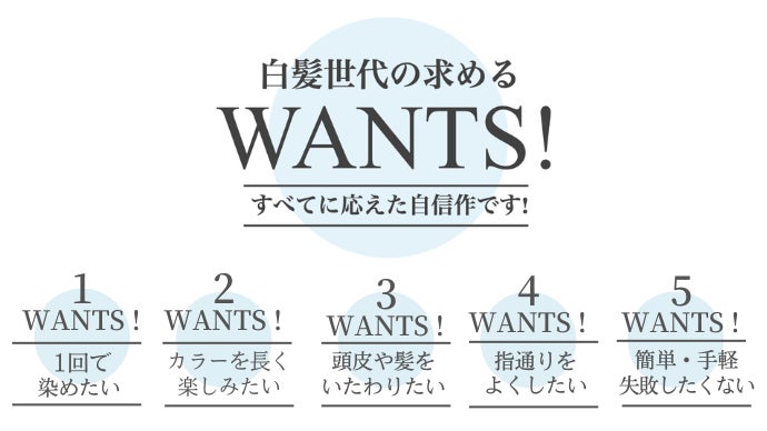 精神的に成熟し、人生を謳歌するミドル世代。見た目に疲れや年齢感を出てくる40代以降の白髪世代にアンケートし、生の声を聞いてみると、実は頭皮や髪に求めること(WANTS!)は大きく5つに分類されることがわかりました。