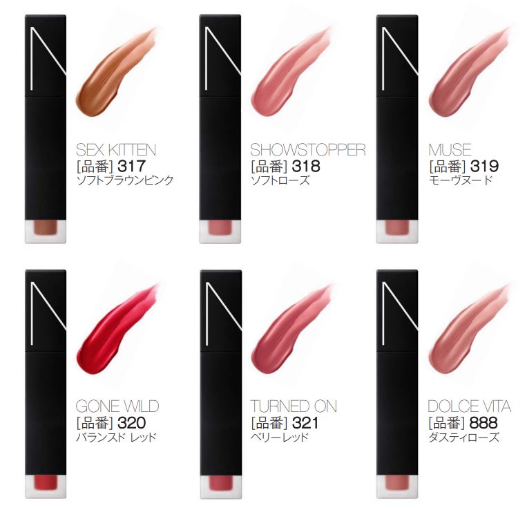 NARSのアイコニックシェード“DOLCE VITA”をフィーチャーしたシェードをはじめ、幅広いシェードレンジの全6色は、スムースで魅惑的な塗り心地と、快適なつけ心地のマット、そして軽いジェルのようなフォーミュラの新感覚リップティントとして登場します。