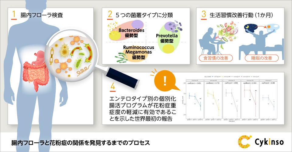 株式会社サイキンソー(本社:東京都渋谷区、代表取締役:沢井 悠、以下サイキンソー)は、SOMPOヘルスサポート株式会社(本社:東京都千代田区、代表取締役社長:平塚 徹、以下SOMPOヘルスサポート)とともに、腸内細菌叢の菌構成別の生活習慣介入による花粉症重症度に対する有効性を検証するための共同研究を実施しました。